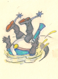 Не се знае за какво мислеше в тази минута Тибул. Но навярно той реши така: „Аз ще мина над площада по тази жица, както съм ходил по въжето в панаира. Няма да падна. Едната жица се простира към фенера, другата от фенера към отсрещната къща. Като мина по двете жици, ще достигна отсрещния покрив и ще се спася.“