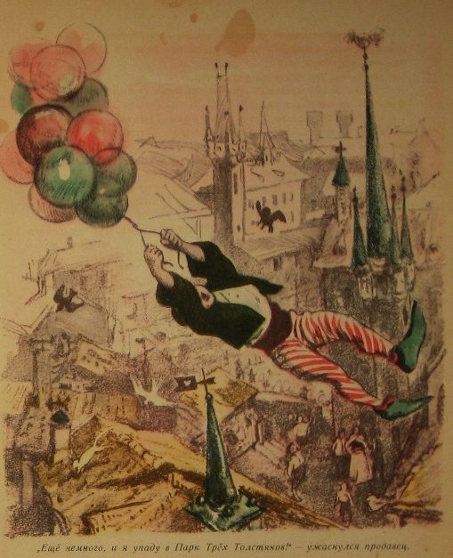Никой не го видя. Само от едно дърво пръхнаха на всички страни изплашени птици. От хвърчащата разноцветна купчина балончета падаше лека въздушна сянка, напомняща сянка на облак. Като просветваше с пъстрите си весели бои, тя се плъзна по една пътечка, посипана с пясък, по една леха, по статуята на едно момче, яхнало гъсок, и по един гвардеец, заспал, както е бил на стража. И от това с лицето на гвардееца станаха чудесни промени. Отведнъж носът му стана син като на мъртвец, после зелен като на фокусник и най-сетне — червен като на пияница. Така, променяйки багрите си, се пресипват стъкълцата в калейдоскопа.