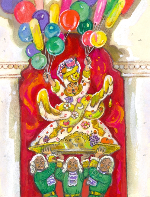 Шестима слуги в сини ливреи вдигнаха огромното блюдо, на което седеше той. Понесоха го. Когато вече се отдалечаваше, той чуваше как му се смееха готварските чирачета.