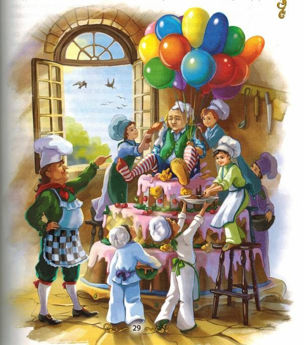 — Дребна работа! — каза главният сладкар също тъй сурово. — В залата изядоха второто блюдо. След двадесет минути ще трябва да се подаде тортата, разноцветните балончета и глупавата муцуна на хвърчащия негодник ще бъдат прекрасно украшение за тържествената торта.