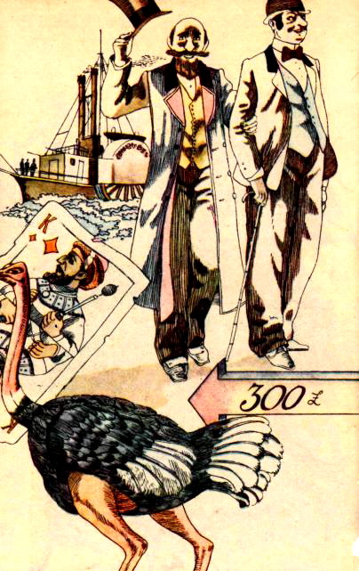 І все ж другого дня ціни на страусів підскочили. Адже птахів стало менше — шанси, отже, зросли. Ті кляті створіння тепер пішли з молотка в середньому по двісті двадцять сім фунтів. І хоч як дивно, а падишахові так і не дістався жоден страус. Жоден. Він тільки марно метушився, а коли треба було пропонувати ціну, починав кричати, що накладе на птахів арешт. Та й сам Поттер вочевидь устромляв йому палиці в колеса. Один страус дістався тихому офіцерикові, другий — торговцеві-єврею, а третього купили гуртом суднові механіки. І тут Поттер наче аж пошкодував, що продав страусів; я, каже, викинув на вітер добру тисячу фунтів, одне слово, пошився, як завжди, в дурні. Та коли я підійшов до нього і спробував його втішити — мовляв, не все ж іще втрачено, адже в нього залишився п’ятий страус, — то виявилось, що Поттер і того птаха продав одному типові з пароплава; то був якийсь політикан, він повертався з Індії, де відпочивав і заразом вивчав звичаї та всілякі соціальні проблеми. Оцей останній страус і пішов за триста фунтів.