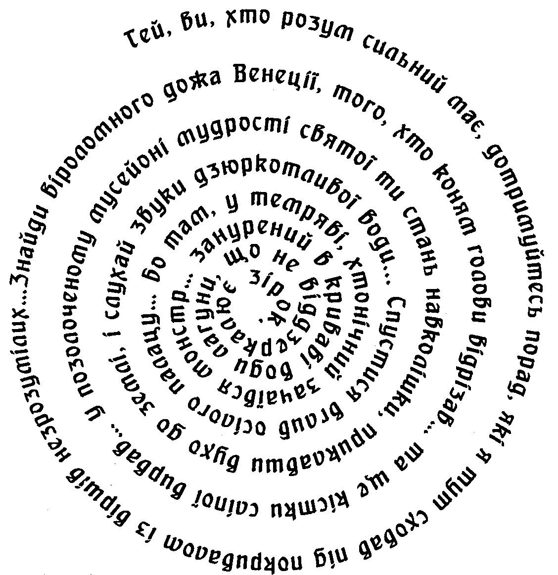 Затамувавши віддих, Ленґдон повільно обертав маску, читаючи текст, який скручувався дедалі щільніше увігнутою поверхнею й закінчувався у центрі.