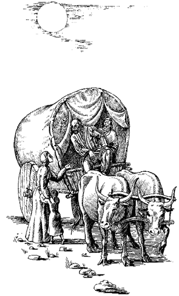 Тим часом під’їхала двоколісна, крита войлоком кантара. Воли ліниво зупинилися перед своїм проводирем. Крізь діряве шатро виглядала молода жінка в чадрі. З-під плоскодонної шапочки, вишитої золотом, спадали змійками на плечі тоненькі косички. Чорні очі пильно зиркали крізь проріз у чадрі.