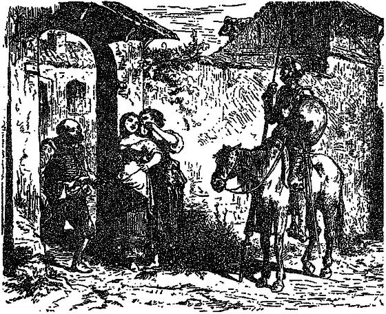 Нечувана для них мова та незвичайна постать нашого рицаря лише збільшили сміх жінок і його незадоволення. Він зайшов би далеко, якби на той час не вийшов корчмар - людина дуже огрядна, а тому й дуже лагідна. Побачивши цю чудернацьку постать, озброєну такою різноманітною зброєю, як спис, щит та панцер, корчмар трохи не приєднався до сміху тих жінок, але, злякавшись усього цього військового приладдя, вирішив бути ввічливим і сказав: