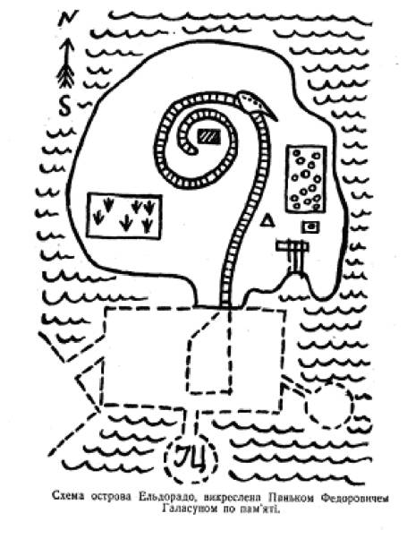 У перших строках своєї записки сообщаю, що Ельдорадо — це є острів, розположений на 35-му градусі північної широти і на 30-му градусі західної довготи в Атлантичнім океані і состоящий на добру половину із чистого золота 999,999 проби. Місцеве руководство острова, ведучи зі мною лічно переговори на високому уровні, дало згоду торгувати золотом на взаємовигідних умовах: за тонну сталі або ж чавуну — тонну золота.
