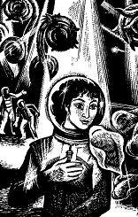 Декілька нових маленьких літунів, радісно тріпочучи, спустилися на гостинну спину. Віола не вагаючись вирвада з кобури пістолет-паралізатор, що його призначали носити на планетах, де припускається розумне, але незнайоме життя. Їй тепер було паплювати на електричні залози, на гамма-промені, на ультразвук і магнітне поле, на все, що могло викинути з себе чудовисько…