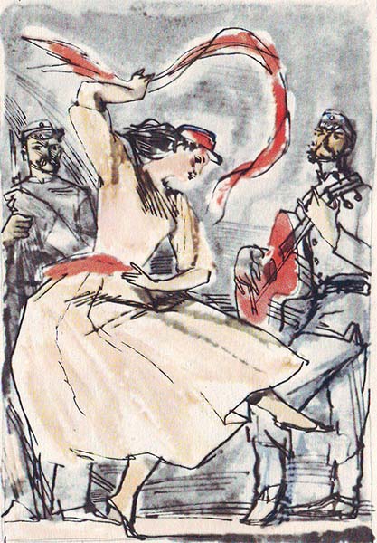 …После ужина коммунары и Домбровский упросили маркитанку батальона Катрин сплясать. В свободный круг, освещенный костром, выбежала девушка. В руках ее бился красный шарф. Она замерла на минуту. Зазвенели струны гитары, и вот четко стукнули каблуки о каменные плиты. Шарф взвился вместе с песней и обнял кружащееся тело.