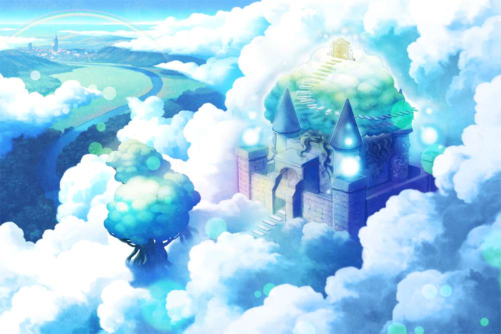 На небольшом пространстве облаков расположено маленькое королевство. Оно похоже на сказочный городок.