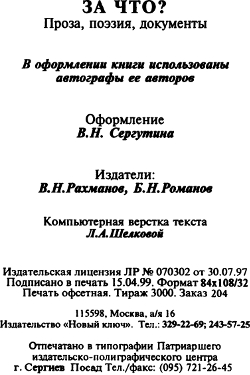 Так что писать об этом надо, так как ведь у многих вообще совесть заросла, а большинство палачей сейчас в больших чинах, кое-кто на «заслуженном» отдыхе, на «почетных персональных» пенсиях, немало из них сейчас в первых рядах перестройщиков. Вот об этом как-то совсем ничего не звучит. А зря. Все это творили не бесплотные духи, а вполне конкретные, злобные, корыстные и понимающие свою выгоду люди. Хотелось бы, чтобы нашла отражение не только тема жертв, но и тема палачей. Правда, это более опасная тема по той причине, что жертвы в основном уже в могилах перегнили, а палачи, вся эта мафия сплочена, жизненна и сильна до сих пор. <…>