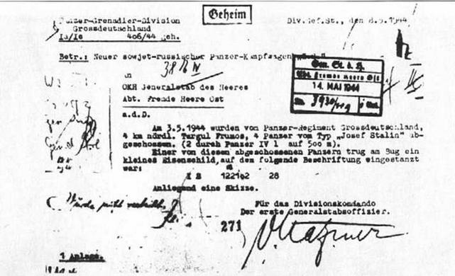 Одно из первых донесений немецкой армии об уничтожении 4-х танков ИС (2 танка были подбиты Pz IV long с дистанции 500 м) в 4 км севернее г. Тыргу-Фрумош. Май 1944 г.