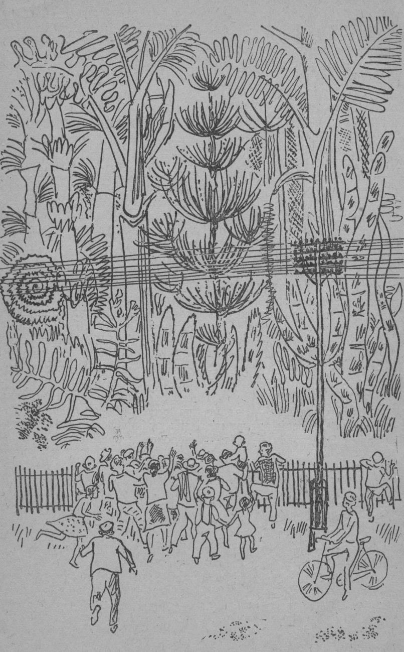 Помойки не было видно под мощной буровато-зелёной рощей неведомых растений. Одни поднимались тонкими чешуйчатыми столбиками, другие напоминали пушистые хвосты белок, третьи торчали голыми круглыми рогами с шишечками на кончиках ветвей. Профессор замер.
