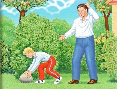 Как-то ему понадобилось опять идти по той дорожке. И только он чуть было не споткнулся о лежачий камень, как его сын, который возвращался из школы, всё увидел, скорей подбежал, да и откатил камень с дорожки, и отец не споткнулся.