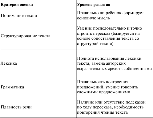 Высшая оценка воспроизведения текста соответствует 10 баллам, 2 балла — правильное воспроизведение, 1 балл — имелись лишь незначительные отклонения от текста, отсутствовали грамматические ошибки, нет длительных пауз, использовались небольшие подсказки, 0 баллов — это неверное воспроизведение текста, нарушение структуры текста, бедность лексики, многочисленные паузы во время пересказа, постоянная необходимость в подсказывании текста.