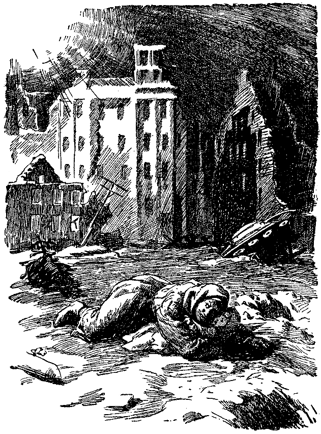 На этот раз ракета фашистов ярко осветила человека на площади, и стало видно, что это женщина, которая ничком лежит на земле, закрыв собой ребёнка. А вокруг, освещённые, как театральные декорации, высились огромные изломы обрушившихся домов крыши, вздыбленные к чёрному небу, опрокинутые танки - и совсем неестественная среди всего этого - маленькая ёлочка.