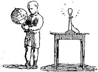 Если вы хотите понять, как и почему происходит смена времен года, сделайте простой опыт. Поставьте стол посреди комнаты, а на стол поставьте зажженную лампу, — пусть она изображает Солнце. Возьмите в руки глобус — Землю — и станьте левым боком к лампе. Глобус должен быть на одном уровне с лам пой, не выше и не ниже ее. Наклоните глобус так, чтобы его Южный полюс был немного ближе к лампе, чем Северный. Начинайте теперь обходить вокруг стола, но не меняйте наклона глобуса. Земная ось, то есть ось глобуса, должна быть направлена все время в одну точку, в какой-нибудь гвоздь или пятнышко, расположенное на стене возле потолка. Это пятнышко пусть изображает Полярную звезду.