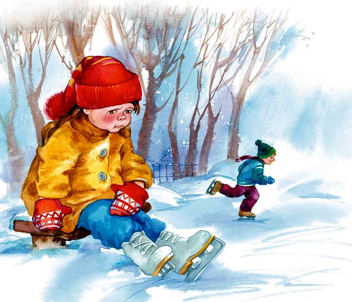 Витя подошёл к ним. Взявшись за руки, все трое весело заскользили по льду. А девочка сидела на скамейке, тёрла ушибленную коленку и плакала.