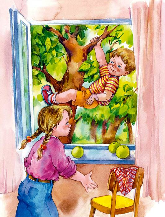 Алёша, как обезьянка, вскарабкался на дерево и, свесившись с нижней ветки, показал сестре нос.