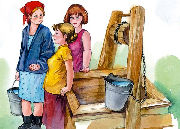 Две женщины брали воду из колодца. Подошла к ним третья. И старенький старичок на камушек отдохнуть присел.