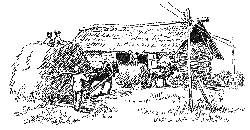 Только последний воз сена увезли, — зашумел по листьям косой ливень. Но был он уже не страшен: сено под надёжной крышей, его не замочит.