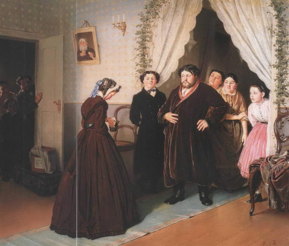 Склонив голову, она вынимает из ридикюля рекомендательное письмо. А далее зрителю предоставляется возможность в деталях рассмотреть представленные «типы» - купеческий недоросль, свысока оглядывающий гостью, испуганная девочка - будущая подопечная гувернантки, купчиха с засученными рукавами, праздная дворня, подглядывающая из боковых дверей. Тщательно выписаны детали интерьера: портрет родоначальника фамилии, дорогая шаль брошена на стул, входная арка обвита зеленью - приметы купеческой роскоши.