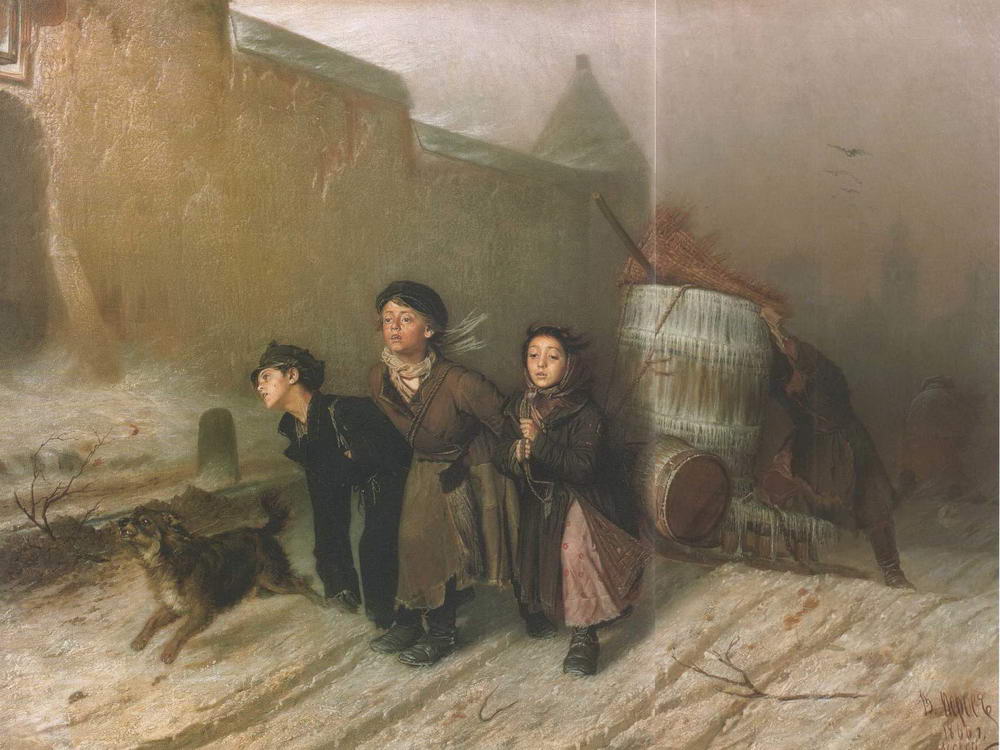 Тройка. Ученики мастеровые, везущие воду стала самой большой по размеру из всех картин, написанных Перовым к тому времени, и уже одно это должно было свидетельствовать о ее важности и значительности. Как и в Проводах покойника, движение в Тройке разворачивается по диагонали, но не в глубину, а из глубины на зрителя, который невольно вынужден «посторониться» или даже отшатнуться, чтобы дать дорогу исступленно шагающей «тройке». Это - крик, стон, призыв. Картина построена по принципу плаката, где пространство разомкнуто в сторону зрителя, и обращенные к нему герои требуют немедленной реакции, вроде «помоги!».
