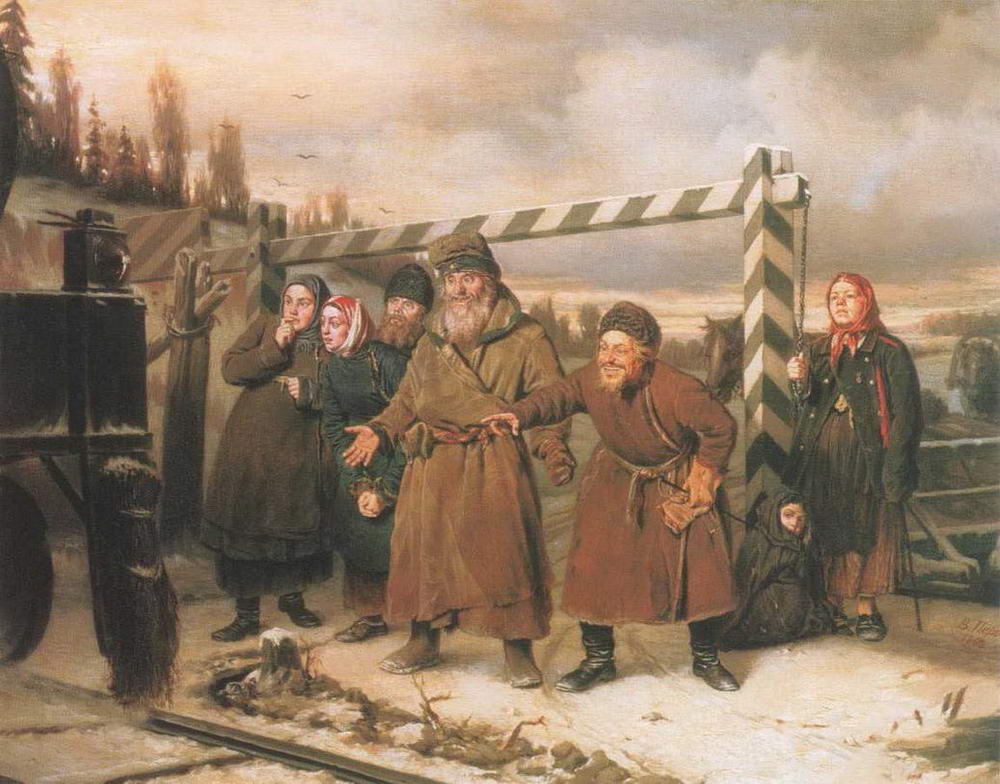 Именно Тройка и Утопленница вместе с Проводами покойника дали повод заговорить о Перове как о «поэте скорби». Но вместе с тем вера в исправление зла силою одной только истины, путем наглядной демонстрации этого зла, начинала угасать. Перов оставался лидером «критического реализма», но лидером одиноким. По-видимому, он и сам это осознавал, так как в конце 1860-х годов в его творчестве начинают появляться иные мотивы, не свойственные прежнему «певцу скорби». Например, Сцена у железной дороги, где кучка мужиков и баб в изумлении глядит на паровоз, - надуманный сюжет, свидетельствующий лишь о том, что Перов вновь «не находит себе места».
