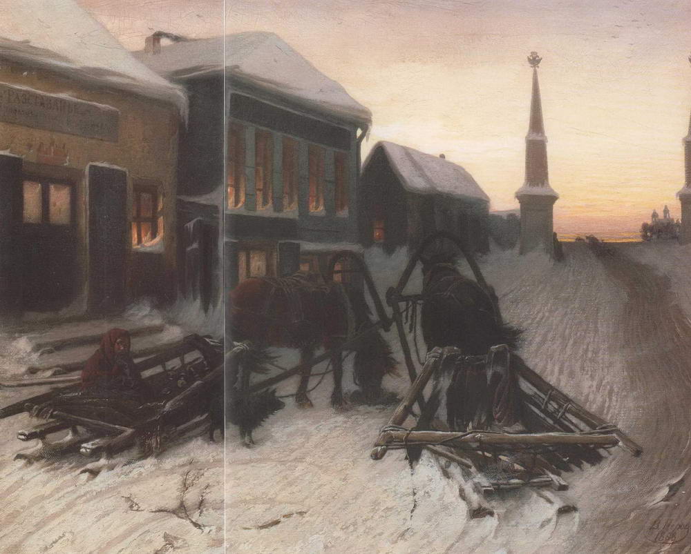 Но даже этот сюжет оказывается сведенным лишь к горящим окнам кабака. Оттого, что здесь «ничего не происходит», становится особенно тоскливо. Женская фигурка в санях ничего не выражает; собачка, которой в прежних картинах отводилась роль едва ли не самого активного действующего лица, не воет, не лает, не бежит, а просто стоит, и ее шерсть треплет поземка. Когда в картинах Перова хоть что-то происходило, и это происходящее было свидетельством зла, которое можно изжить и преодолеть, то предполагалось, по крайней мере, что это зло исчислимо, его можно назвать, на него можно указать. А здесь оно становится буквально безобразным, то есть не имеющим образа, неисчислимым и неопределимым. Вместо назывательной, содержательной функции слова первостепенное значение приобретает его интонация. Это музыка тоски, уныния и безразличия, монотонная жизнь, где не на чем остановить взгляд. Она не тусклая, не невзрачная, а вообще «никакая».