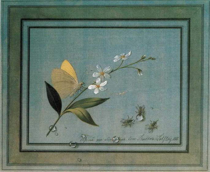 Подписывая натюрморты, Толстой каждый раз указывал, что рисовал с натуры. Художник запомнил свой первый натюрморт - веточку со светло-лиловыми цветочками, которую, сорвав в саду на даче в Царском Селе, он запечатлел на бумаге.