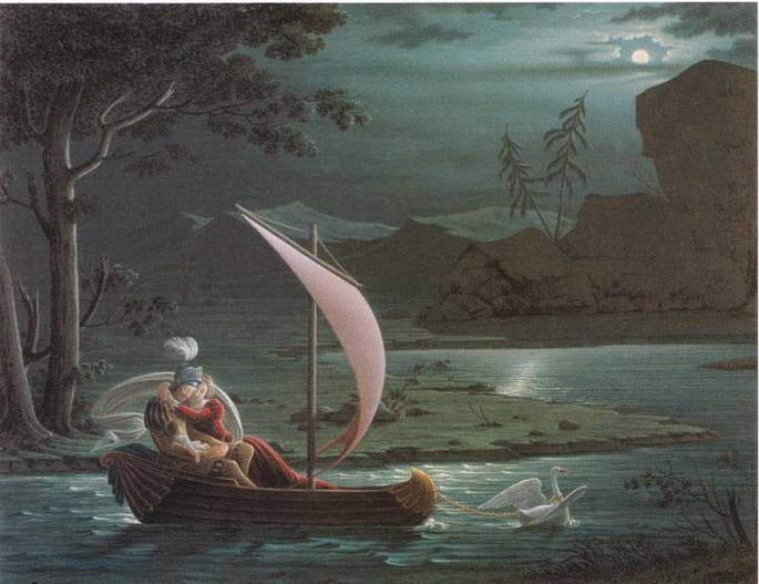 Через двадцать лет Толстой написал акварель Рыцарь Лебедя, отдающий в жертву своего первого ребенка (1841). Но в этой работе трагизм чувств и события растворился в нежности лунного света, блеске играющей воды, изысканной красоте белого лебедя, розового паруса и гармонии голубых и бирюзовых красок.