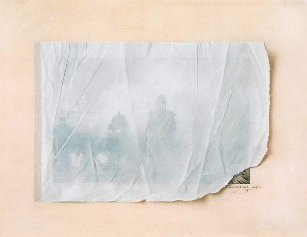 Созданные магией белил и туши на белом листе бумаги смутно различимые очертания деревьев, старинных зданий, чьих-то одетых в белое фигур, манят своей таинственностью, вызывая желание приподнять закрывающий их лист бумаги. Но увидеть то, что скрыто листком, не дано. Что было важнее для художника: иллюзия реальности листка, сквозь который чуть виден пейзаж с башнями, или сам архитектурный пейзаж, который лишь чуть угадывается и должен остаться тайной?