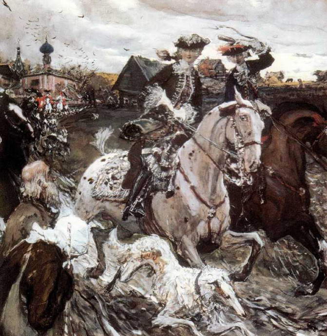 В 1900-1902 годах Серовым были выполнены иллюстрации к изданию Царская охота, выпускавшемуся по инициативе полковника Николая Ивановича Кутепова, заведующего хозяйственной частью дворцовой службы. Это было роскошное четырехтомное издание, в иллюстрировании которого также принимали участие Бенуа, Виктор и Аполлинарий Васнецовы, Репин, Суриков и другие знаменитые мастера. Сюжеты для иллюстрирования предоставлялось выбирать самим художникам, и Серов, «зараженный» страстью мирискусников к XVIII веку, выбрал эпизоды из времени Петра I, Елизаветы и Екатерины II.