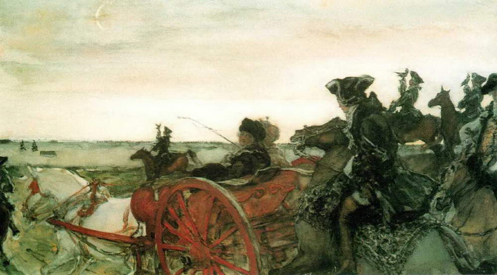 В воссозданной Серовым атмосфере эпохи ясно ощутима историческая дистанция, с которой художник начала XX века бросает взгляд в век восемнадцатый. Охоты, церемониальные выезды,царские забавы, подобно музейным редкостям, становятся здесь предметом эстетического любования, выглядят (как и у большинства мирискусников) красивой, но давно забытой сказкой, вызывающей одновременно и улыбку и легкую грусть.