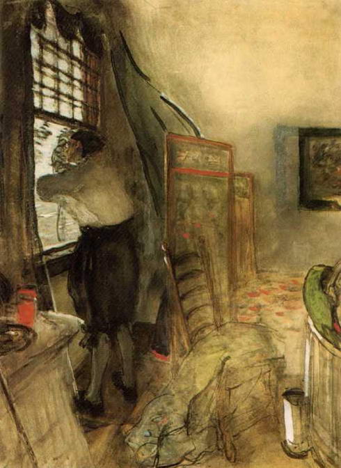 Едва закончив работы «кутеповской серии», художник начал работу над картиной Петр I в Монплезире, где задумал изобразить императора в спальне, во время утреннего туалета, в тот момент, когда Петр, прильнув к окну, высматривает появившееся на горизонте судно. «Он только что встал, - пересказывал Серов замысел картины Александру Бенуа, - не выспался, больной, лицо зеленое». Эта натуралистическая деталь - «лицо зеленое», как и все серовское представление о Петре I, выдает желание художника найти в новой для него области исторической живописи возможность достижения портретной убедительности, как если бы историческая картина была для художника явлением, запечатленным с натуры, и именно в силу этой убедительности обретала бы ценность исторического факта.