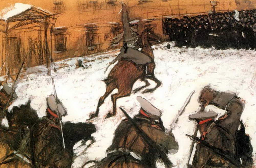 Заостренная в злой гротеск композиционная парафраза и символическая пародия на сюжет (псовая охота) этой «картинки из прошлого» - кадр из хроники событий 1905 года «Солдатушки, бравы ребятушки, где же ваша слава?», где изображена атака на толпу демонстрантов.