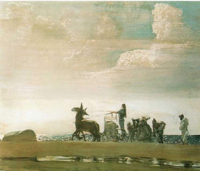 Шествие Навзикаи разворачивается «на грани неба и земли», там, где смыкаются море, земля и небо. Это простой прием, переносящий все видимое в область небесно-морского видения. В то же время интересно, что Серов признавался Александру Бенуа, что «хотел бы написать Навзикаю не такой, какою ее изображают обыкновенно, а такой, какой она была на самом деле». Поэтому зорко наблюденные и схваченные детали: большие уши мулов, грациозная стать Навзикаи, силуэты женщин, несущих тяжелые корзины с бельем, понуро бредущий и вместе с тем величественный Одиссей, закутанный в свежие простыни, - создают эффект зарисовки с натуры, как если бы Серов расписался в том, что «он здесь был» и все происходящее «между небом и землей» видел собственными глазами.