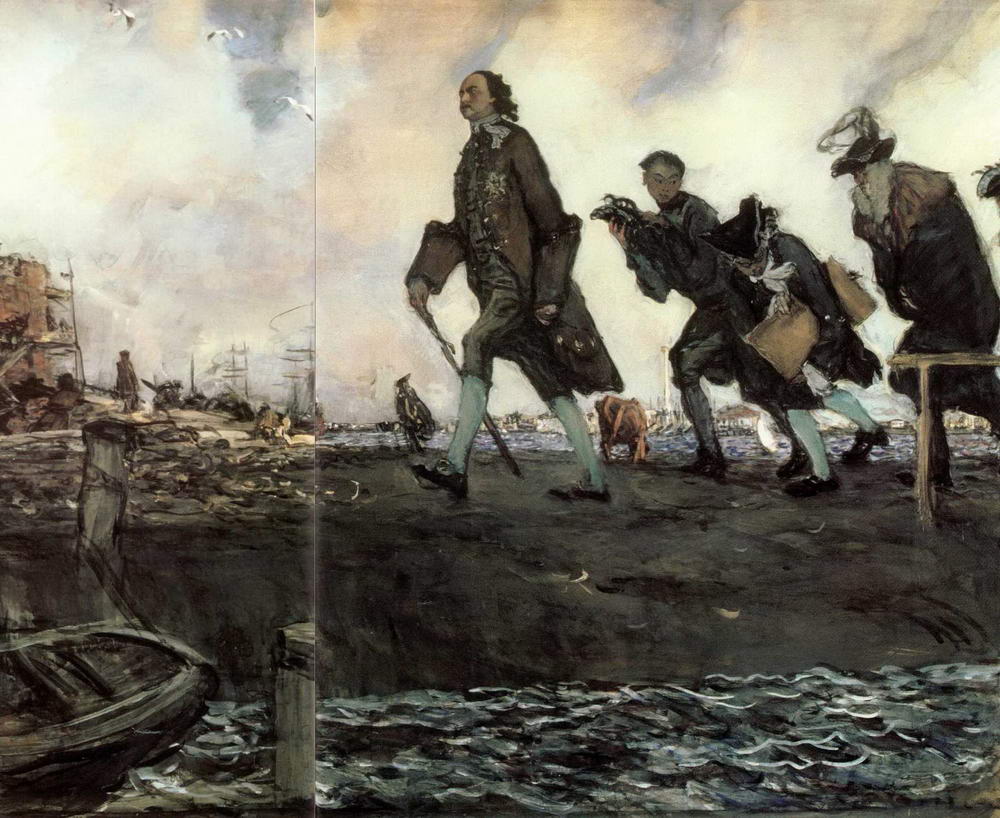 Картина Серова представляет не только Петра, но и его столь же «ужасное и прекрасное», как и он сам, творение - Петербург. Петр со свитой шествует по необжитой, суровой земле, где бродят коровы, «по мшистым, топким берегам», к которым подступают, «котлом клокоча и клубясь», тяжелые невские волны. На дальнем же плане - панорама города, ряд построек вдоль берега реки, среди которых возносится сверкающий, словно озаренный солнцем, проглянувшим вдалеке во время грозы, шпиль Петропавловского собора. Эта панорама, эта бледно-сиреневая вода, цвет которой столь резко контрастирует с общим тоном картины, напоминают несколько условную театральную декорацию, на фоне которой разворачивается действие. Известно, что строительство Петропавловского собора с его знаменитым шпилем было завершено лишь почти десятилетие спустя после смерти Петра. Зрелище на дальнем плане - прекрасное видение, словно пророчество о будущем великом городе: