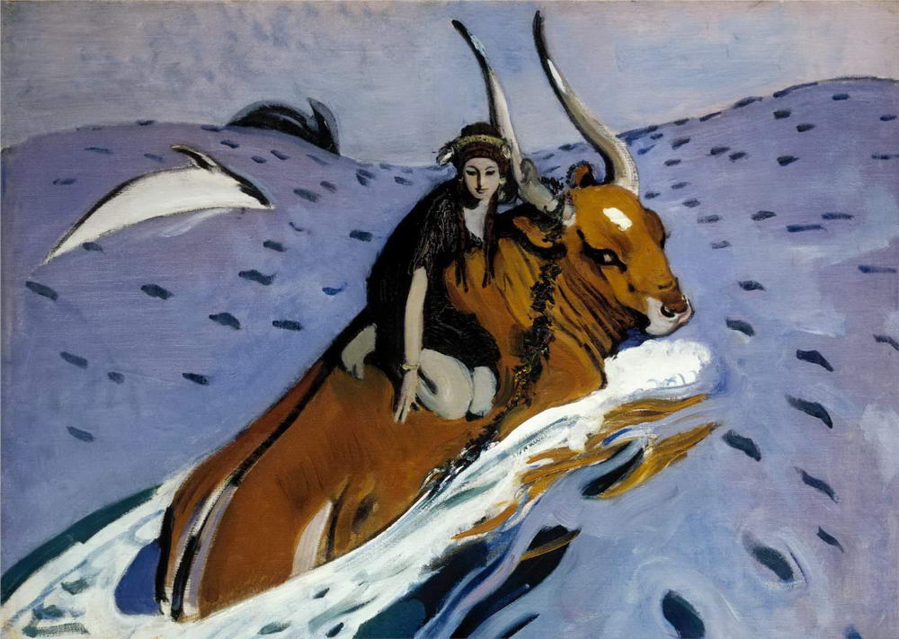 Похищение Европы Серова - не столько изображение мифа, сколько его отблеск, эмблема всего мира греческого искусства с его «высокой декоративностью, граничащей с пафосом», как говорил Серов в одном из писем. Часто присутствующий в работах художника момент игры с художественными воспоминаниями явлен и здесь: ритмично ныряющие дельфины напоминают, например, фрагмент росписи килика Диониса, выполненного греческим мастером VI века до н. э. Экзекием, да и бык напоминает изображения быков на древнегреческих сосудах (быть может, отчасти поэтому Серов первый из художников, изображавших миф о похищении Европы, отступил от первоисточника, рассказывающего о белом быке с золотыми рогами - коричневый бык напоминает о росписях краснофигурных ваз). Неожиданно живой и осмысленный взгляд быка- Зевса подчеркивает застылость неподвижного лица-лика Европы - маски архаической коры, своего рода символа всего греческого искусства. Одно из значений имени «Европа» - «широкоглазая», что удивительно созвучно тому изображению лица Европы, которое дает Серов.
