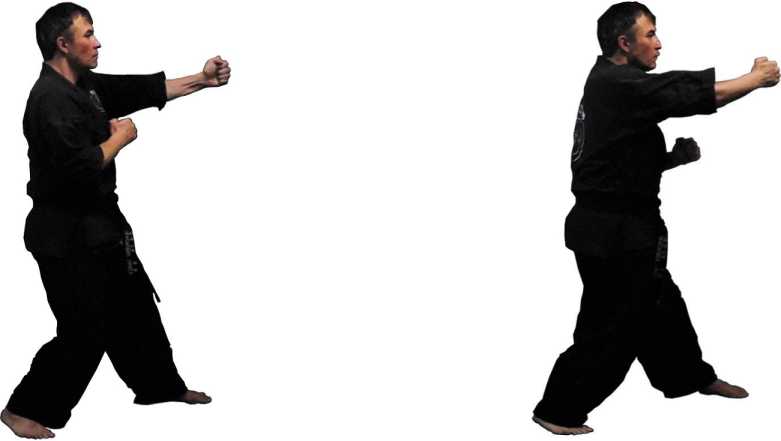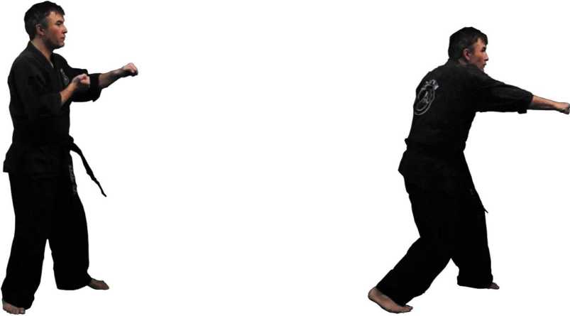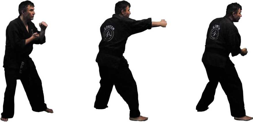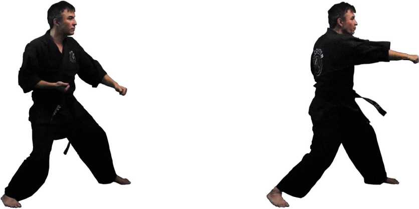 В каратэ также существуют одноименный и разноименный удары - соответственно, ои-цки и гяку-цки. Но так как они оба наносятся из одной и той же канонической стойки, большого различия в их динамике нет - хотя и здесь разноименный удар оказывается сильнее одноименного.