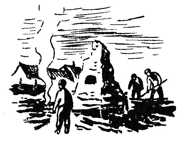 Митя долго сидел на дороге и смотрел на черные балки. Вот в том углу была голубятня. Там жили его замечательные голуби… Митя лег на траву и задумался. Он очень любил голубей. И они, да, они любили его тоже. Бывало выпустит он их, а они сядут ему на плечи и катаются — не боятся. Он прогонит их, а они — снова к нему на плечи.