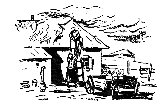 На крышу по деревянной лесенке с ведром воды в руках взбирается женщина, а за ней — мальчишка лет десяти, тоже с ведром. Видит Яшка: горит крыша. Вылила женщина всю воду на крышу и слезла. В огонь уже снова разгорается.