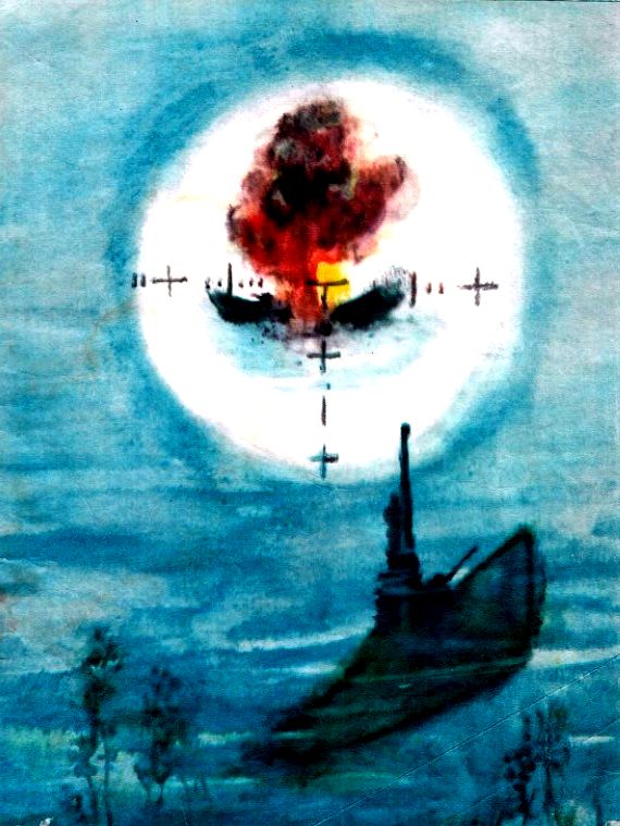 А сам в перископ наблюдает за крейсером. Видит, остроносая торпеда с взрывчаткой поплыла под водой к цели. Она всё ближе, ближе к вражескому крейсеру. Есть! Раздался громовой взрыв, корабль окутался чёрно-красным дымом, раскололся, как орех, на две половинки и стал тонуть.