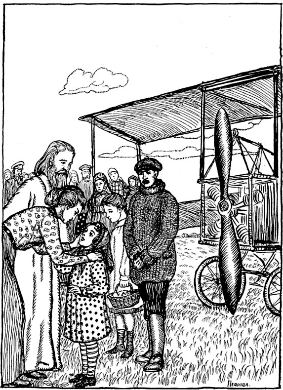 Зашумела машина аппарата, и воздушная птица, пробежав по полю, стала плавно подниматься в воздух. Вот все выше и выше парит она над Дерябкинским полем, вот все меньше и меньше делается она в глазах людей.