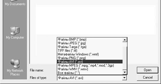 Особый интерес при создании меню представляет подвижный фон – видео из файла. Выберите видеофайл, содержимое которого будет фоном для меню, так же, как и обычный графический файл (с помощью того же окна открытия файла), только укажите в фильтре расширение видеофайла (например *.avi, как на рис. 11.21).