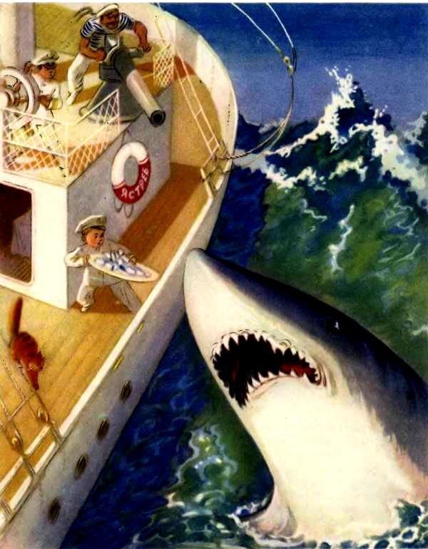 По палубе бежит боцман, за ним, как всегда, неотступно Ай и Ой.
