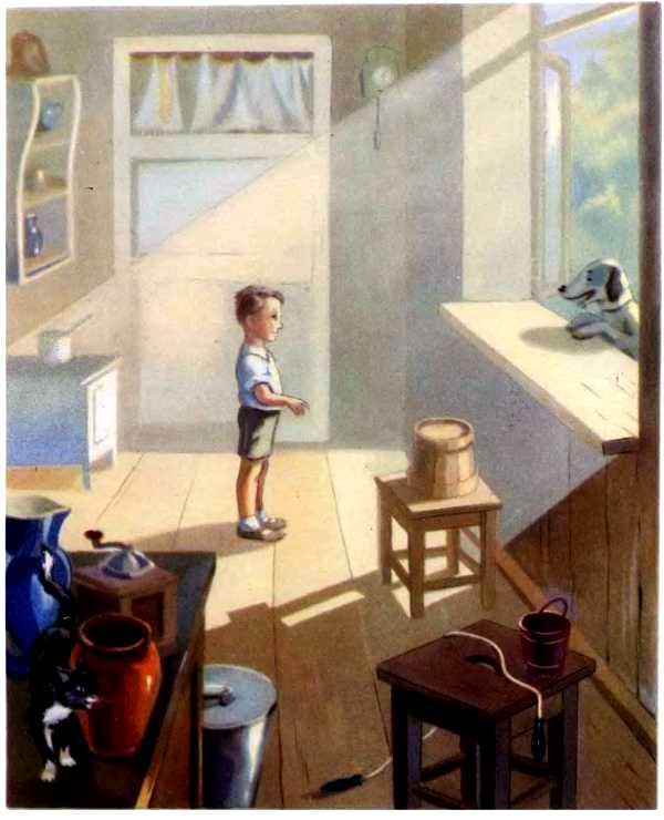 Он влезает через окно в кухню, смотрит на кадушку с тестом, грустно садится на табурет. За окном раздается лай Дружка. Коля вскакивает, подбегает к окну, смотрит и снова нерешительно возвращается.