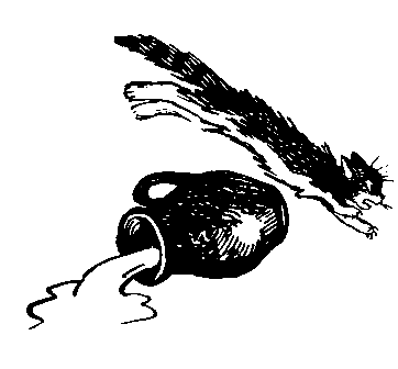 Котенок Мурлыка касается языком молока и вдруг, вздрогнув, стремительно спрыгивает на пол и принимается с жалобным воем бегать по кухне.