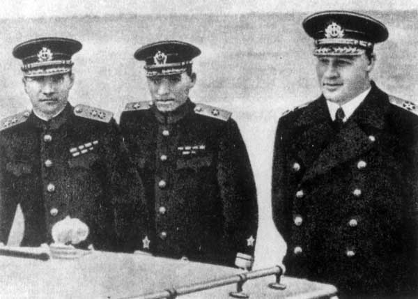 Справа — налево: Н.Г. Кузнецов, контр-адмирал Н.В. Антонов и вице-адмирал Н.М. Харламов на Краснознаменной Амурской флотилии. Конец августа 1945 г.