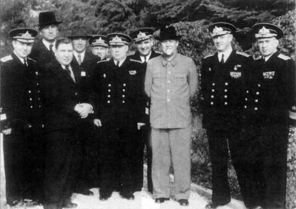 Главнокомандующий ВМС СССР адмирал флота Н.Г. Кузнецов приветствует премьер-министра Великобритании У. Черчиля, прибывшего на Ялтинскую конференцию. 3 февраля 1945 г.