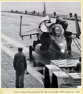 Легкие штурмовики Як-38 базировались на 4 тяжелых авианесущих крейсерах проекта 1143 («Киев», «Минск», «Новороссийск», «Баку»). Формирование первого в истории отечественного флота корабельного авиаполка (279-й отдельный корабельный штурмовой авиаполк, ОКШАП) началось в Саках в 1973 году. Первые посадки на Як-36М на палубу крейсера «Киев» выполнили 18 мая 1975 года летчик-испытатель МАП О.Г. Кононенко и летчик-испытатель НИИ ВВС В.П. Хомяков. Построенный в Николаеве крейсер «Киев» предназначался для Северного флота. Переход на север «Киев» выполнил в июле 1976 года. В это время на корабле провели семь летных смен, в ходе которых летчики 279-го ОКШАП выполнили 45 полетов.