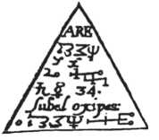 Давай это пить больному с маленьким глотком розовой воды по утрам, затем 4 часа он ничего не должен есть. Эту процедуру следует применять в течение 29 дней. За это время изготовь металлическую пластину следующим образом: чистого беспримесного золота три части. Когда Луна будет в 12 градусах Рака, расплавь золото в глиняном сосуде и вылей в чистую воду. Заметь тот момент, когда в небе соединятся две планеты, и точно в это время вновь расплавь золото; при встрече двух планет добавь к золоту, расплавленному в глиняном сосуде, чуть самого чистого серебра таким образом, чтобы слиток получился наполовину золотым, наполовину серебряным. Когда сплав остынет, выкуй из него квадратную пластину со стороной в 4 пальца, затем вырежи из нее треугольник, как показано ниже.